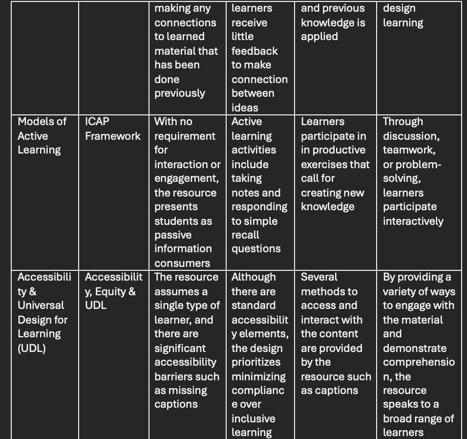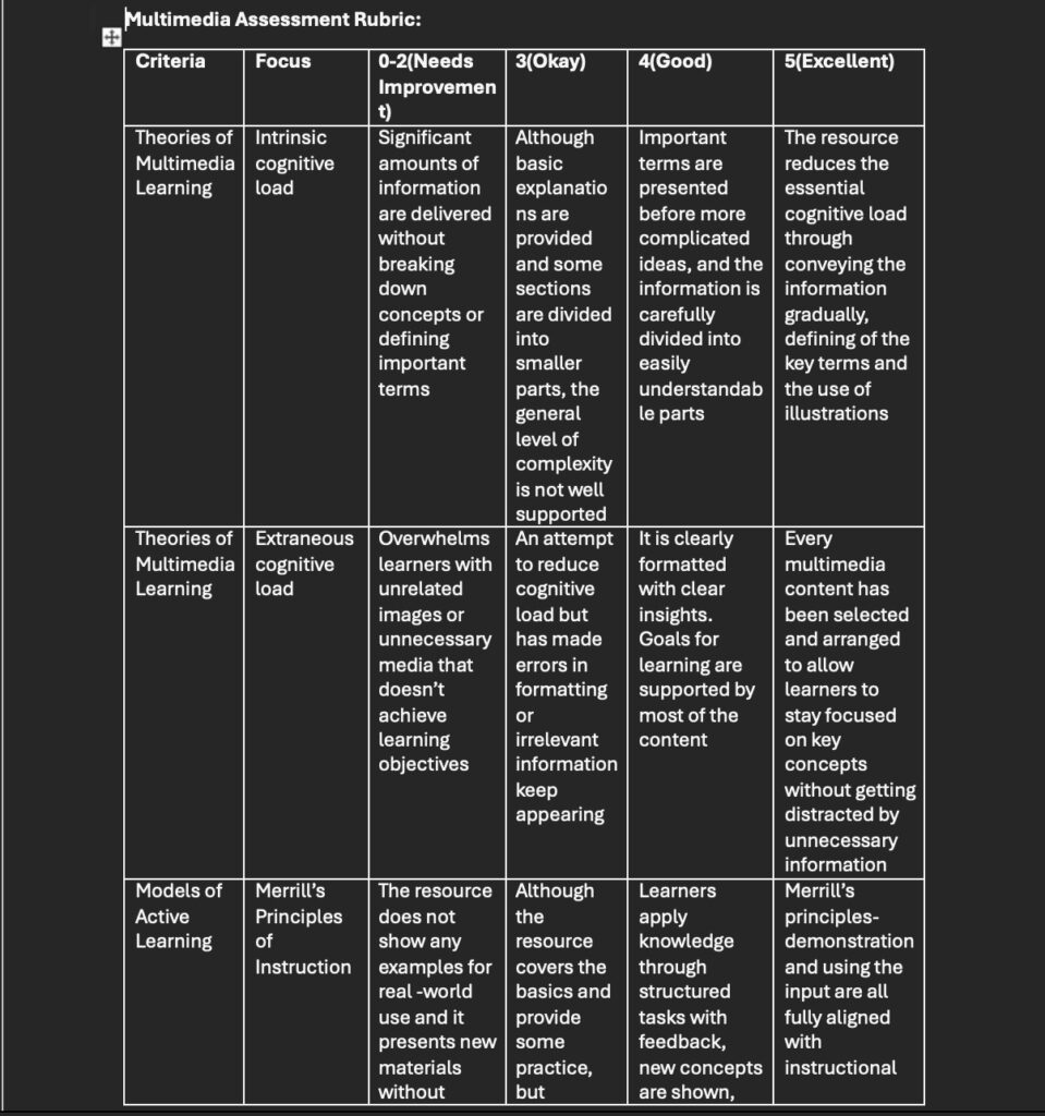 In this assignment, the goal of this rubric is to incorporate key theories of multimedia learning, principles of Universal Design for learning, and models of active learning into a thorough, reliable tool for assessing the quality of academic multimedia resources. Based on multimedia learning theory, the rubric focuses on design features like signalling and coherence, using headings, summaries, and visual cues to highlight important ideas while reducing unnecessary content that can increase cognitive load. From an active learning perspective, the rubric looks at how resources encourage learner control, practice, and feedback, such as allowing learners to choose their pace, adjust task difficulty, and reflect on their progress. Grounded in UDL, the rubric examines whether resources provide multiple ways for learners to access information, stay engaged, and show what they understand through different formats and interactive elements. Together, these principles help ensure the rubric evaluates not just what is being taught, but how well the design supports meaningful, accessible, and active learning.